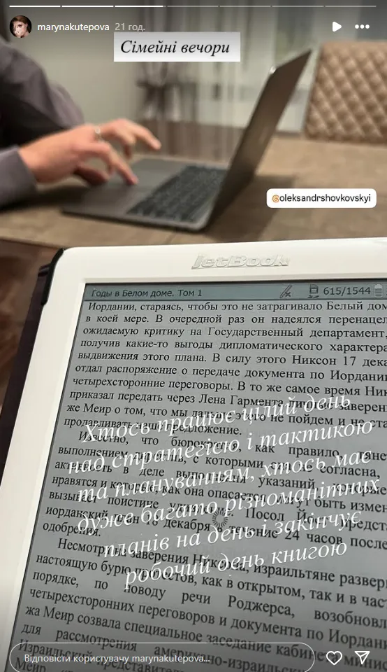 «Сімейні вечори. Хтось працює цілий день над стратегією і тактикою та плануванням, хтось має дуже багато різноманітних планів і закінчує робочий день книгою», – написала Кутепова.