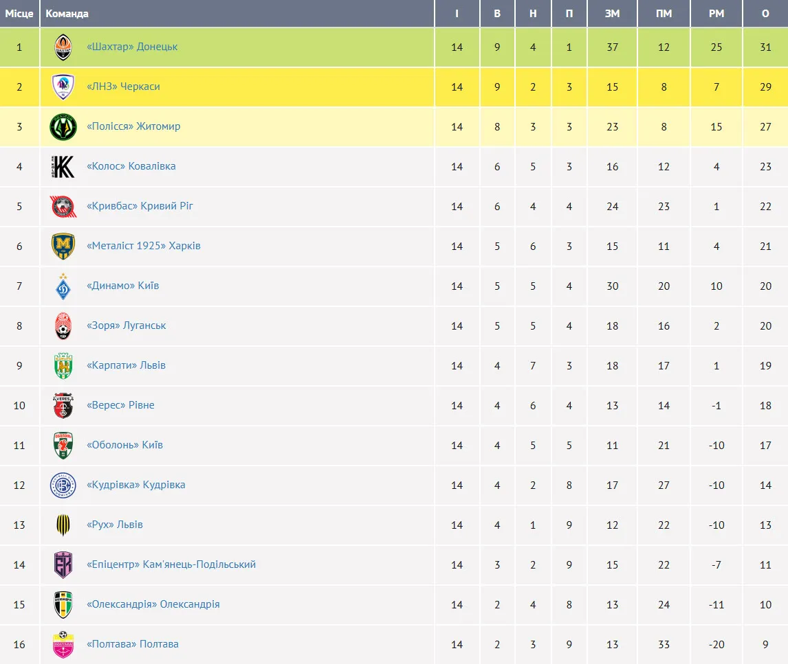 Провали Динамо та Шахтаря: як виглядає турнірна таблиця УПЛ після 14-го туру