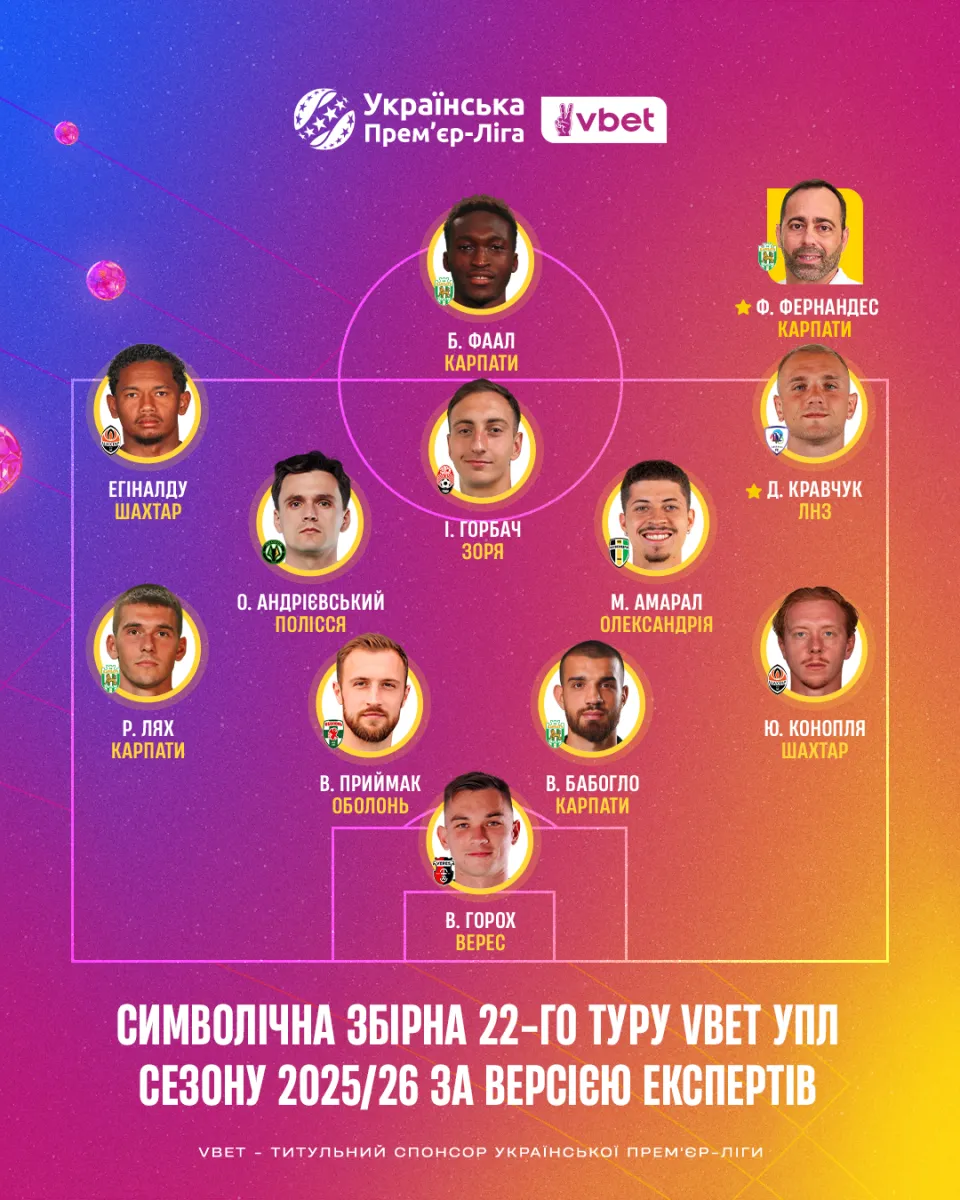 Пресслужба Української Прем’єр-ліга повідомила, хто потрапив до символічної збірної 22-го туру чемпіонату, а також визначила найкращих тренера та футболіста.