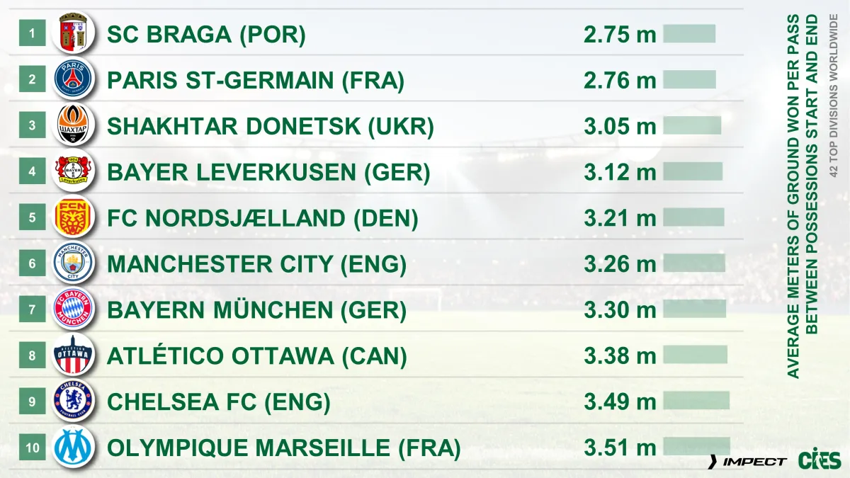 Шахтар просуває м'яч у середньому на 3,05 метра за одну передачу. Вище за українців опинилися лише французький ПСЖ (2,76) та португальська Брага (2,75), яка очолює рейтинг за показником найменшої відстані, пройденої за один пас між початком і кінцем володіння м'ячем.