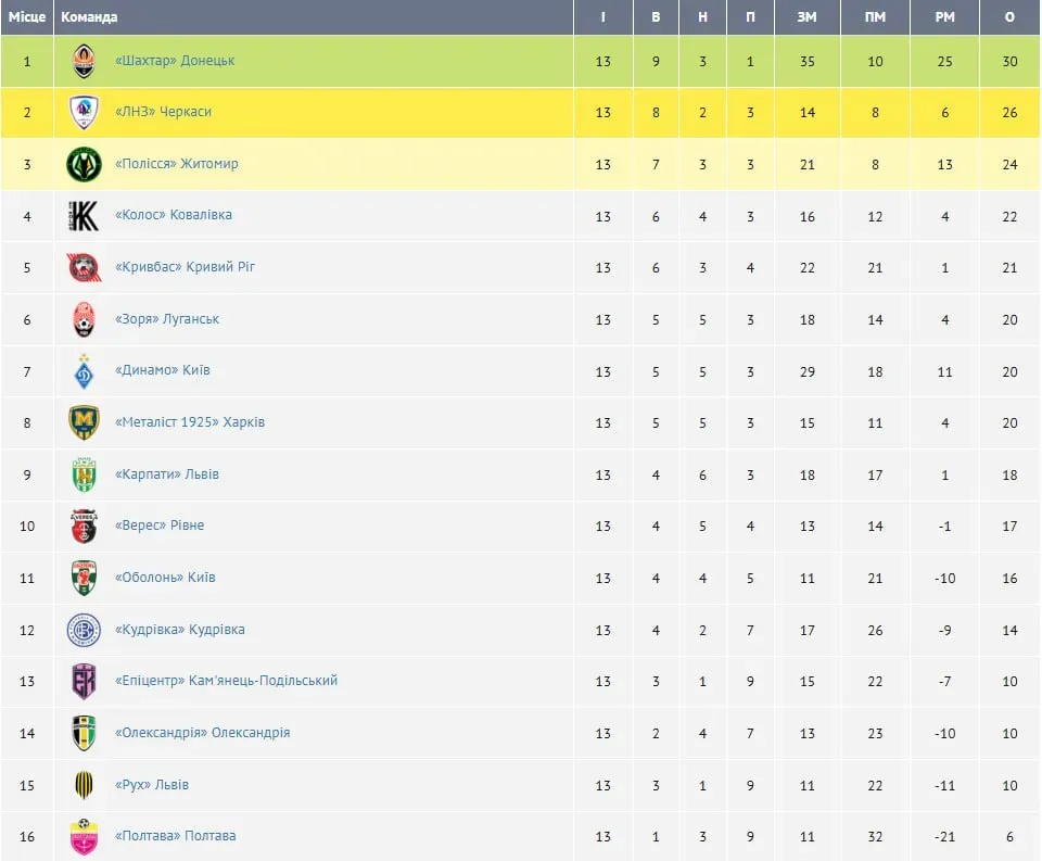 У найближчу п’ятницю, 28 листопада, Оболонь і Колос своїм очним матчем розпочнуть 14-й тур УПЛ. До вашої уваги турнірна таблиця УПЛ станом на зараз (після 13 турів).