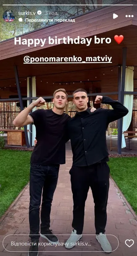 Племінник президента Динамо Ігоря Суркіса, воротар В'ячеслав Суркіс, відзначив ювілей нападника київського клубу Матвія Пономаренка, привітавши його з 20-річчям у соціальній мережі Інстаграм.