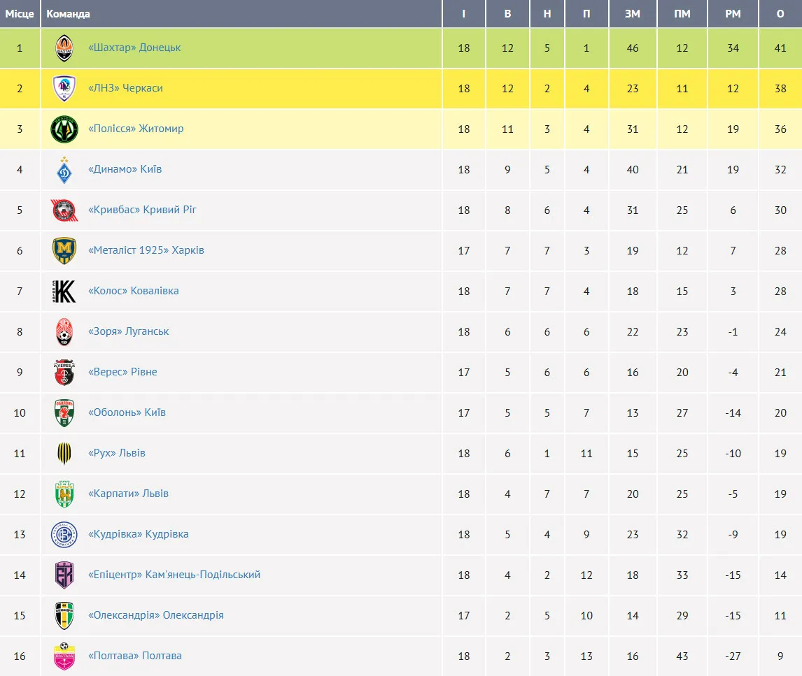 Турнірна таблиця УПЛ після матчів 18-го туру: Шахтар відірвався від ЛНЗ, а Динамо гониться за Поліссям