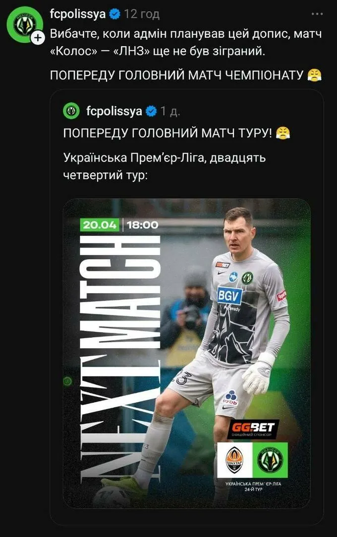 «Вибачте, коли адмін планував цей допис, матч Колос – ЛНЗ ще не був зіграний. Попереду головний матч чемпіонату».