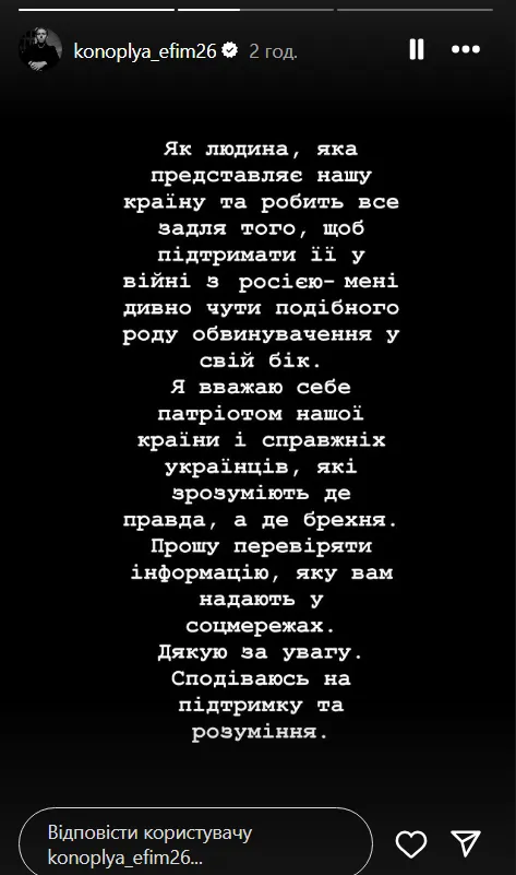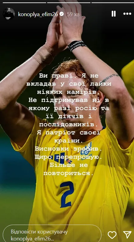 «Ви праві. Я не вкладав у свої лайки ніяких намірів. Не підтримував ні в якому разі росію та її діячів і послідовників. Я патріот своєї країни. Висновки зробив. Щиро перепрошую. Більше не повториться», – написав Конопля в Instagram.