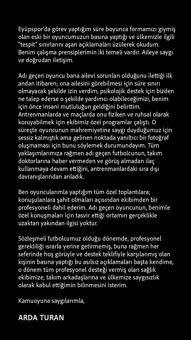Головний тренер Шахтаря Арда Туран у власному Instagram виступив з офіційною заявою у відповідь на резонансне інтерв'ю свого колишнього підопічного часів роботи в Еюпспорі Джонджо Шелві, який назвав наставника маніяком, що був одержимий віскі і сигарами.