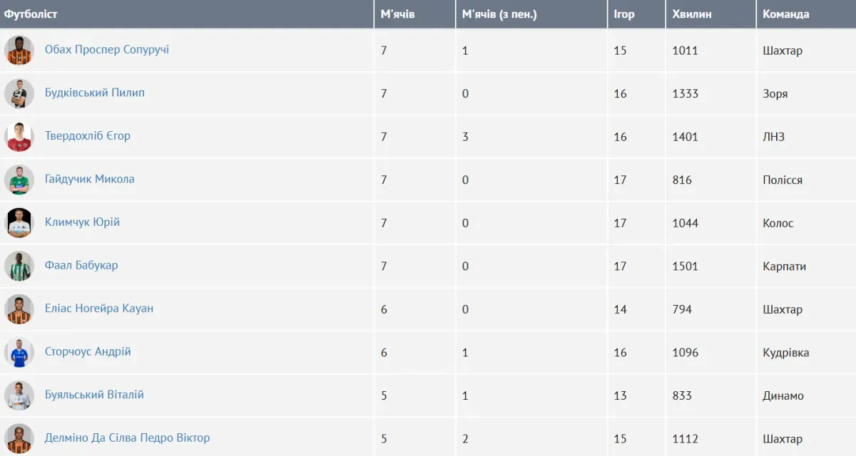 Друге місце займає форвард і капітан Зорі Пилип Будківський, якому знадобилися 16 ігор, щоб сім разів відзначитися у воротах опонентів. Третю позицію посідає півзахисник ЛНЗ Єгор Твердохліб. Він забив сім голів (три – з пенальті) у 16 матчах за Кривбас.